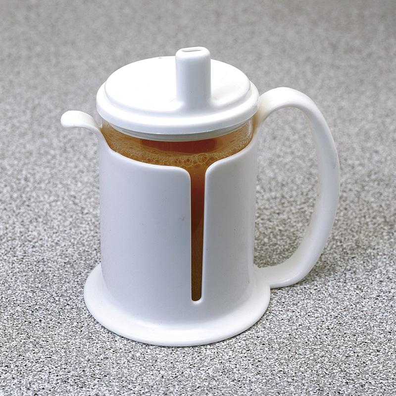 Vaso transparente con tetina de la firma sueca ETAC. El diseño especial del soporte permite agarrar el vaso con seguridad con las dos manos, incluso con poco agarre o tono muscular débil.